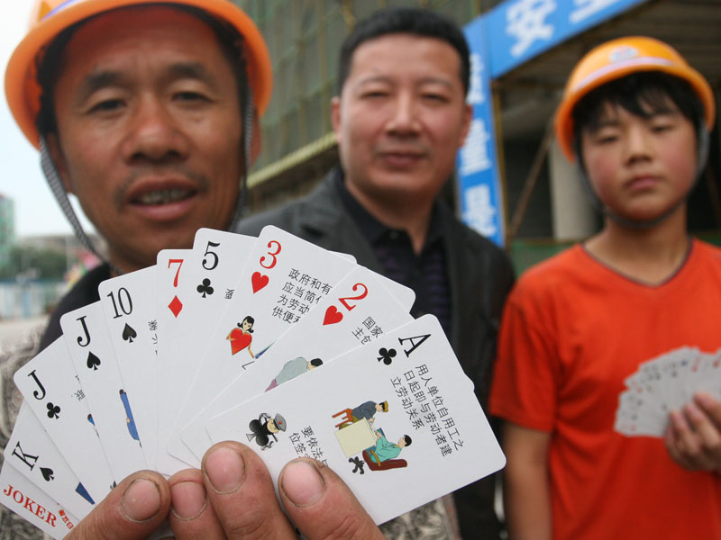 為工地農(nóng)民工發(fā)放普法撲克牌